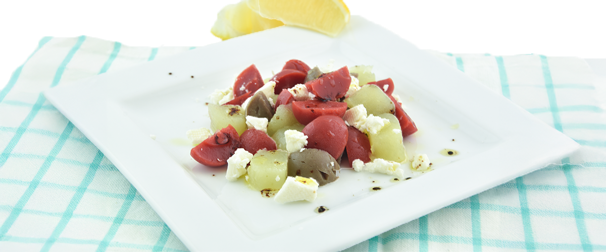 To assemble, arrange the cucumber, tomatoes and olives on plates.