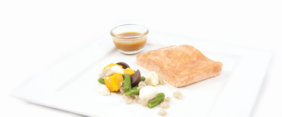 Gently poached salmon fillets, pureed and finished with a savoury miso glaze, served alongside puréed vegetables or salads. A nutritious, visually appealing meal for poeple on an IDDSI Level 4 pureed diet.
